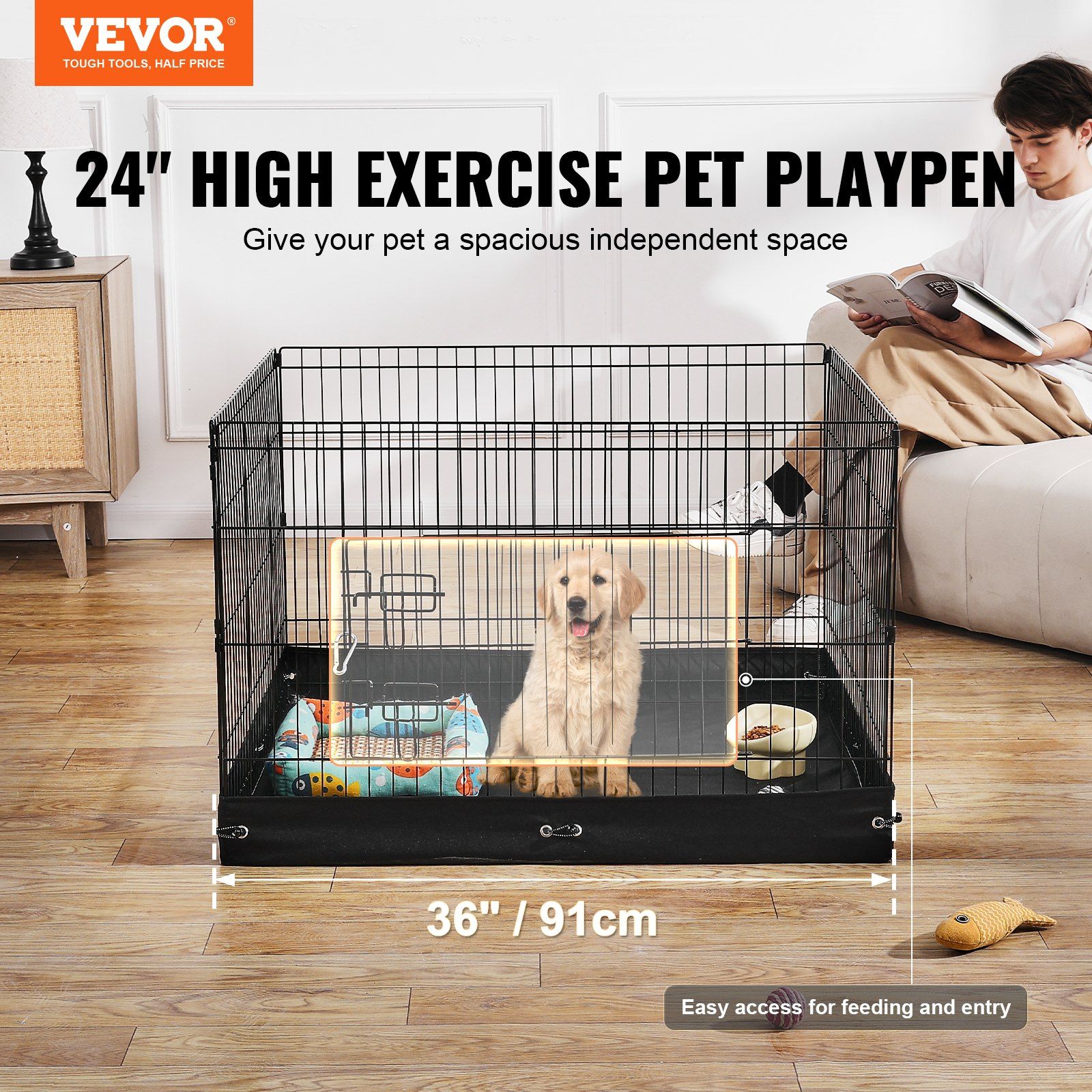 1.Versatile Use: This dog playpen is composed of 4 panels that form a spacious 36" x 36" square. The door opens all the way to the top, allowing easy access for the owner.
